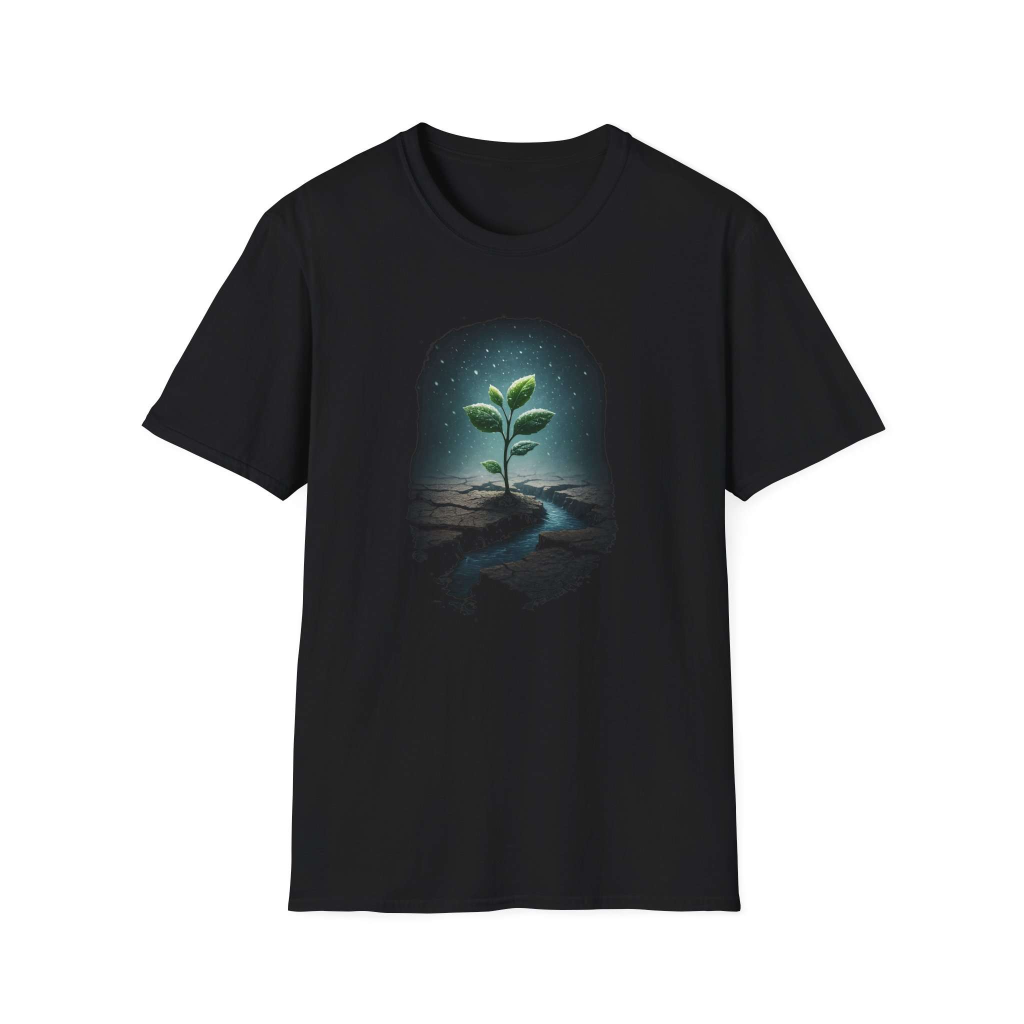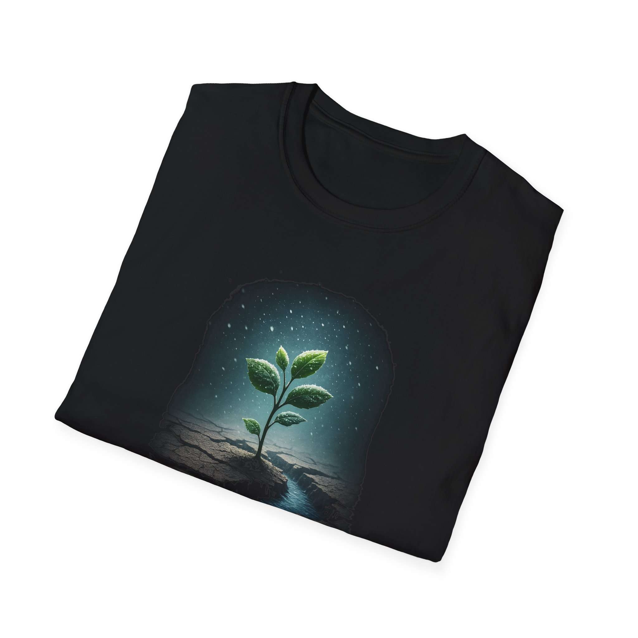 This striking design, inspired by Purpose Through Pain, features a resilient green sprout emerging through cracked earth and falling snow — a symbol of growth, healing, and hope. Fading softly into the fabric, the artwork blends naturally onto the shirt, creating a premium look without harsh borders.